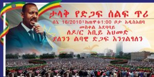 ኢትዮጵያዊነታችን የውርደት ካባ ሳይሆን የክብር ጌጥ እንዲሆን በየሄደበት የሚጠይቅና ጠይቆም “እምቢ” የማይባል መሪንና ሃሳቦቹን መደገፋችን፤ ሰላማችንን ማብዛት ነው። የሀገራችንን ህዳሴ እውን ለማድረግ በሚደረገው የአዲስ መንገድ ውልደት ጥረት ላይ የየራሳችንን ጠጠር መወርወር ነው። ዴሞክራሲያችን በይቅርታና በመቻቻል ላይ እንዲመሰረት መወሰን ነው። እናም በስልጡን መንገድ ሃሳባችንን ሰላማዊ በሆነ ሁኔታ ለመግለፅ ሳንጠራ እኛው ራሳችን እዚያው እንገኛለን። መስቀል አደባባይ። ቅዳሜ ሰኔ 16 ቀን 2010 ዓ.ም። ኑ! ለውጡንና መሃንዲሱን አብረን እንደግፍ!…